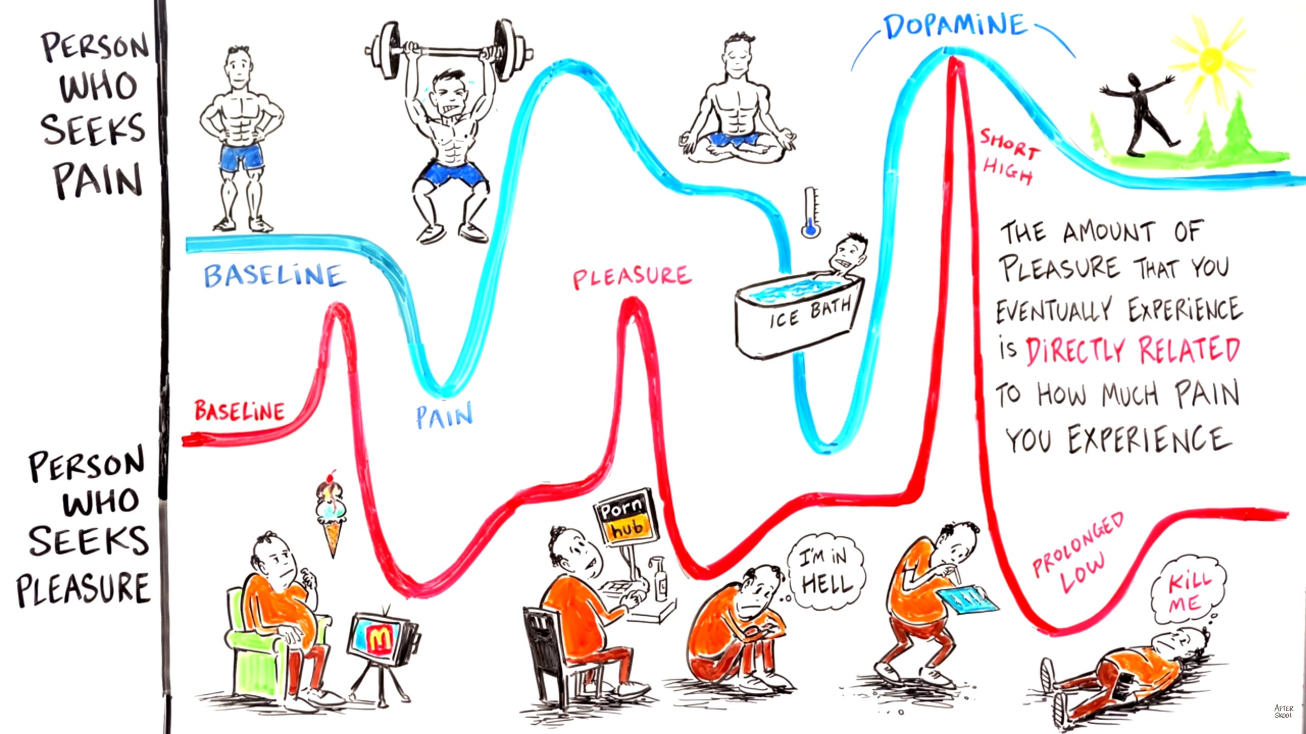 Meaning: if you voluntarily put yourself through some amount of pain, your dopamine baseline resets itself at a higher level than before the pain. With this in mind, you can plan to afford some pain to sustain “happy times” throughout the day. Huberman calls it creating a “Summer in your body”. It’s like a healthy flywheel to push yourself further. I’ve been trying ice baths with my wife and even if they’re scary, we always come out in a better mood. Dopamine levels reach at an all-day high, and we can “consume” our dopamine safely until night comes.